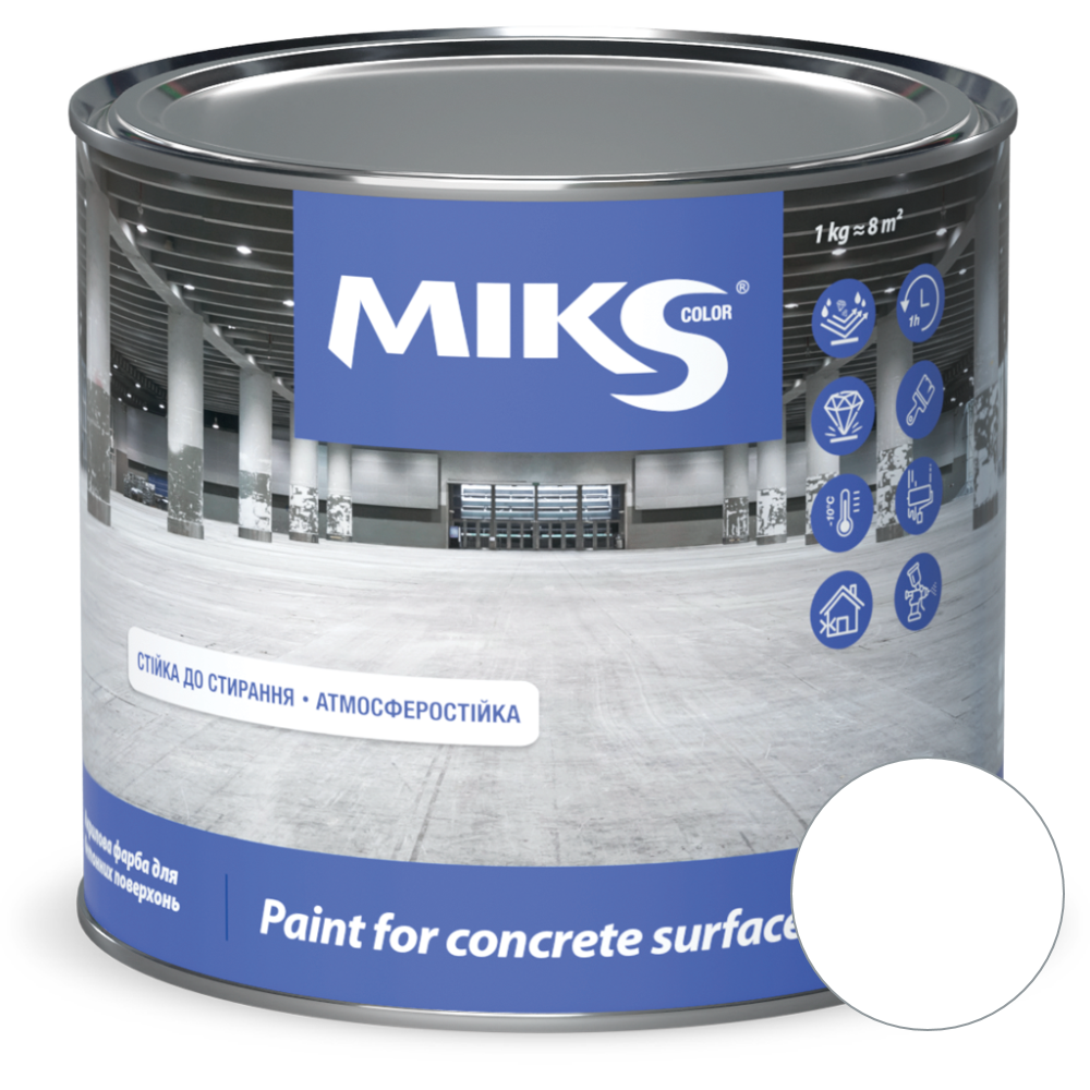 У компанії підключені електронні платежі. Тепер ви можете купити будь-який товар не покидаючи сайту.Miks фарба для бетонних поверхонь – це акрилова органорозчинна фарба для бетонних підлог усередині та зовні приміщень.
